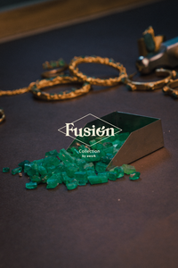 Consiguelo AquíJoya exclusiva de FUSIÓN Collection, brazalete con Esmeraldas naturales en bruto incrustadas y fabricada en Bronce con enchapado en Oro de 24 k. Todas nuestras piezas son libres de níquel.