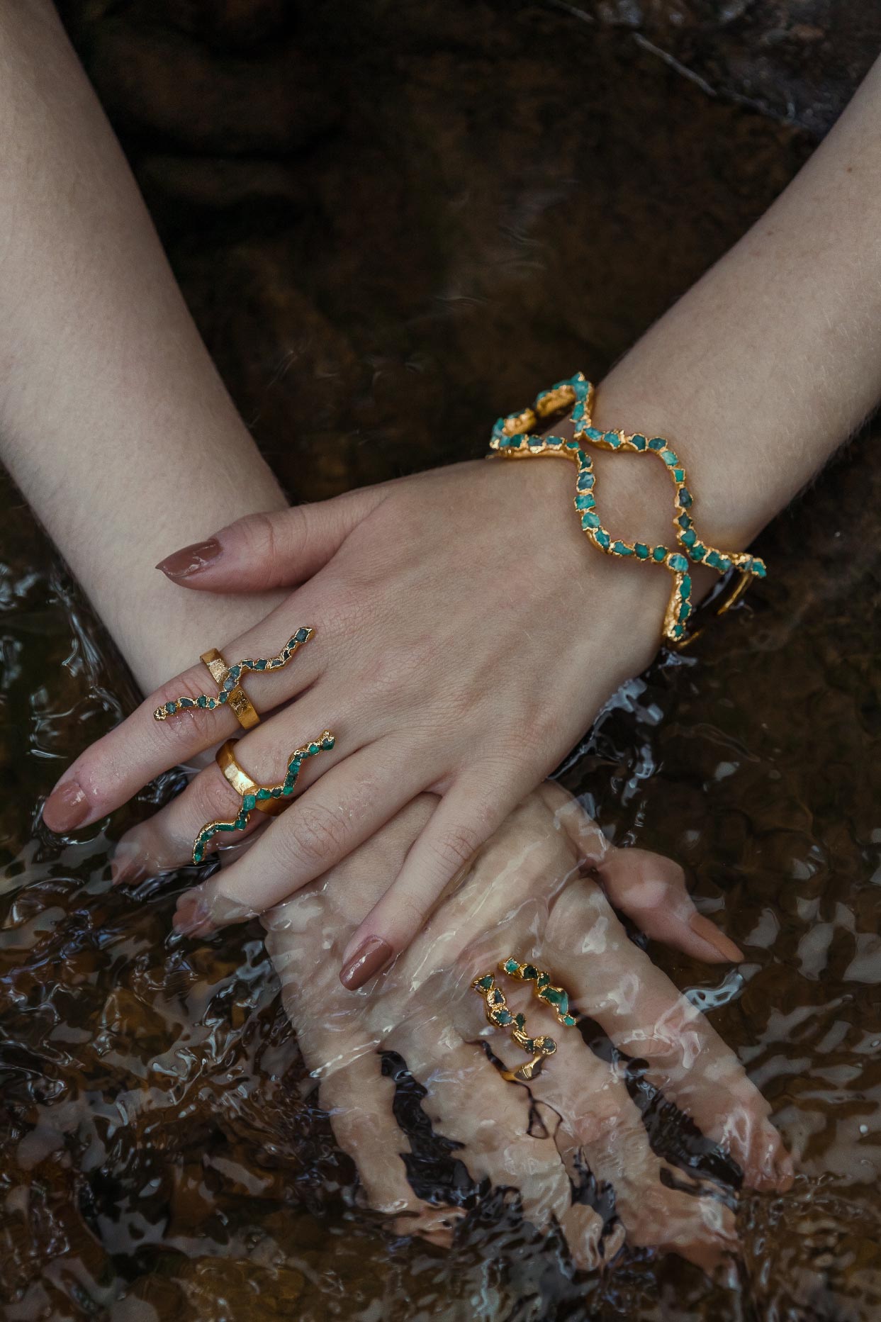 Joya exclusiva de L'AMOUR Collection, anillo con esmeraldas naturales en bruto incrustadas y fabricada en Bronce con enchapado en Oro de 24 k. Todas nuestras piezas son libres de níquel.