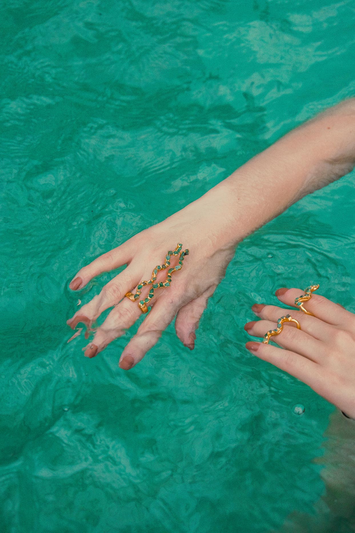 Joya exclusiva de Ríos Collection. Pieza en bronce con enchapado en oro de 24K y esmeraldas naturales