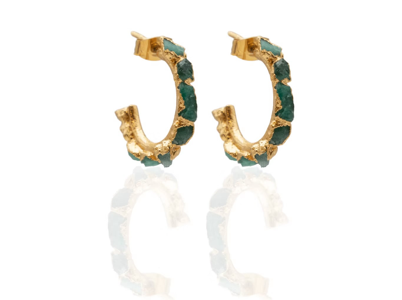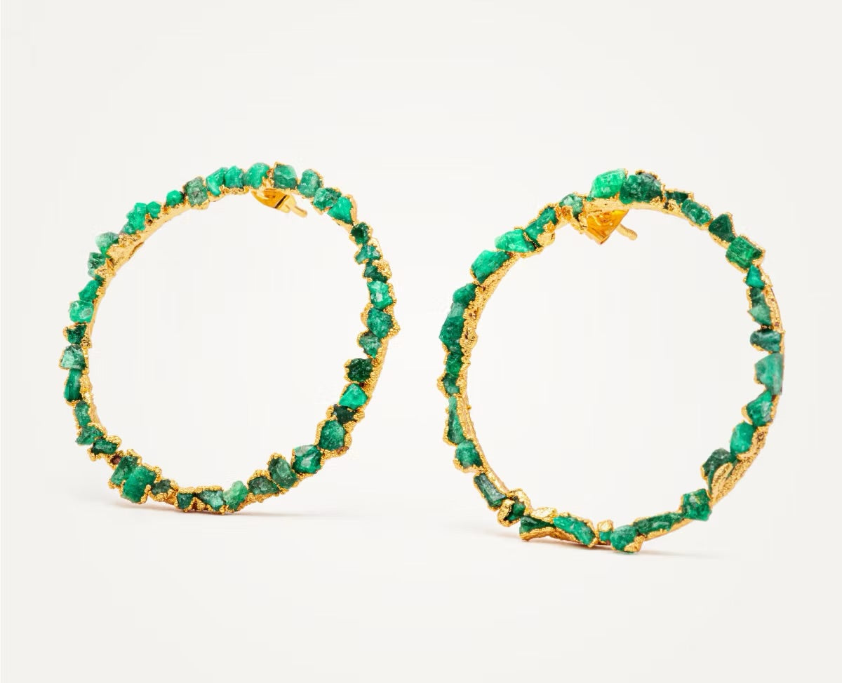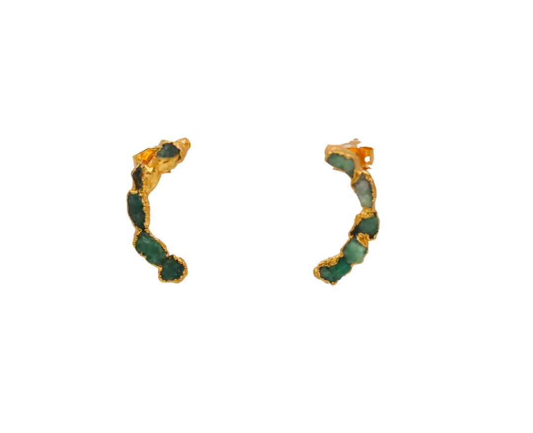 Joya exclusiva de L'AMOUR Collection, shoker con esmeraldas naturales en bruto incrustadas y fabricada en Bronce con enchapado en Oro de 24 k. Todas nuestras piezas son libres de níquel.