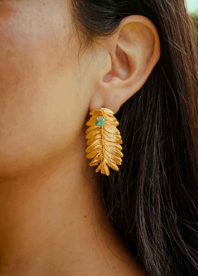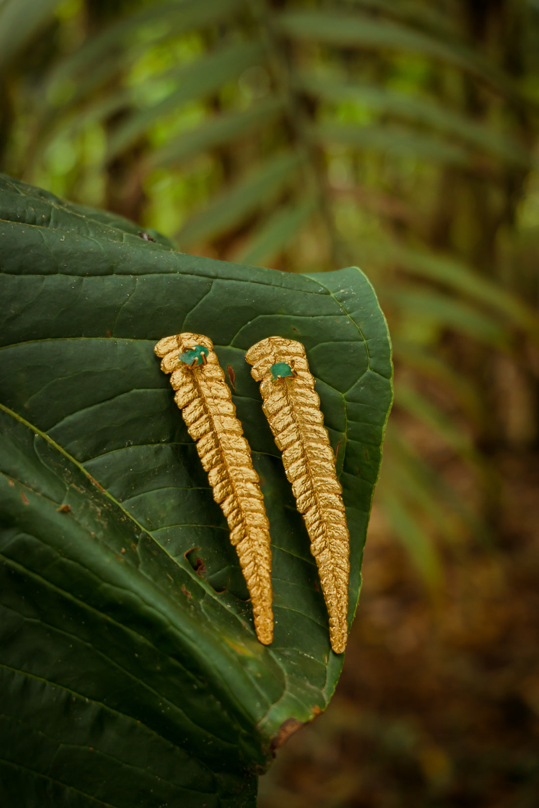 Joya exclusiva de NATURALEZA VIVA Collection, hecha a partir de una hoja natural. Pieza enchapada en Oro de 24 k y con esmeralda natural en bruto. Todas nuestras piezas son libres de níquel.