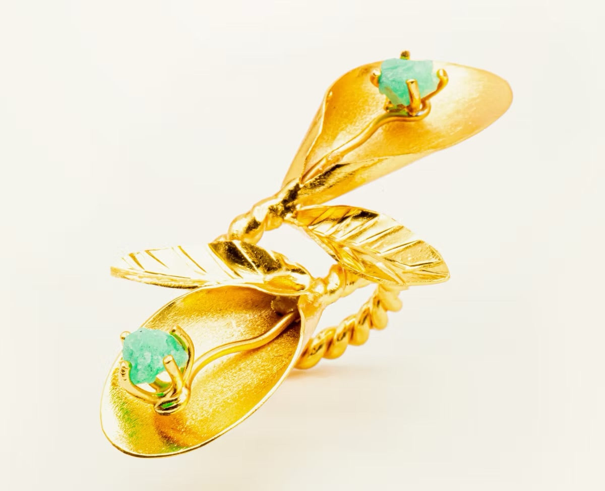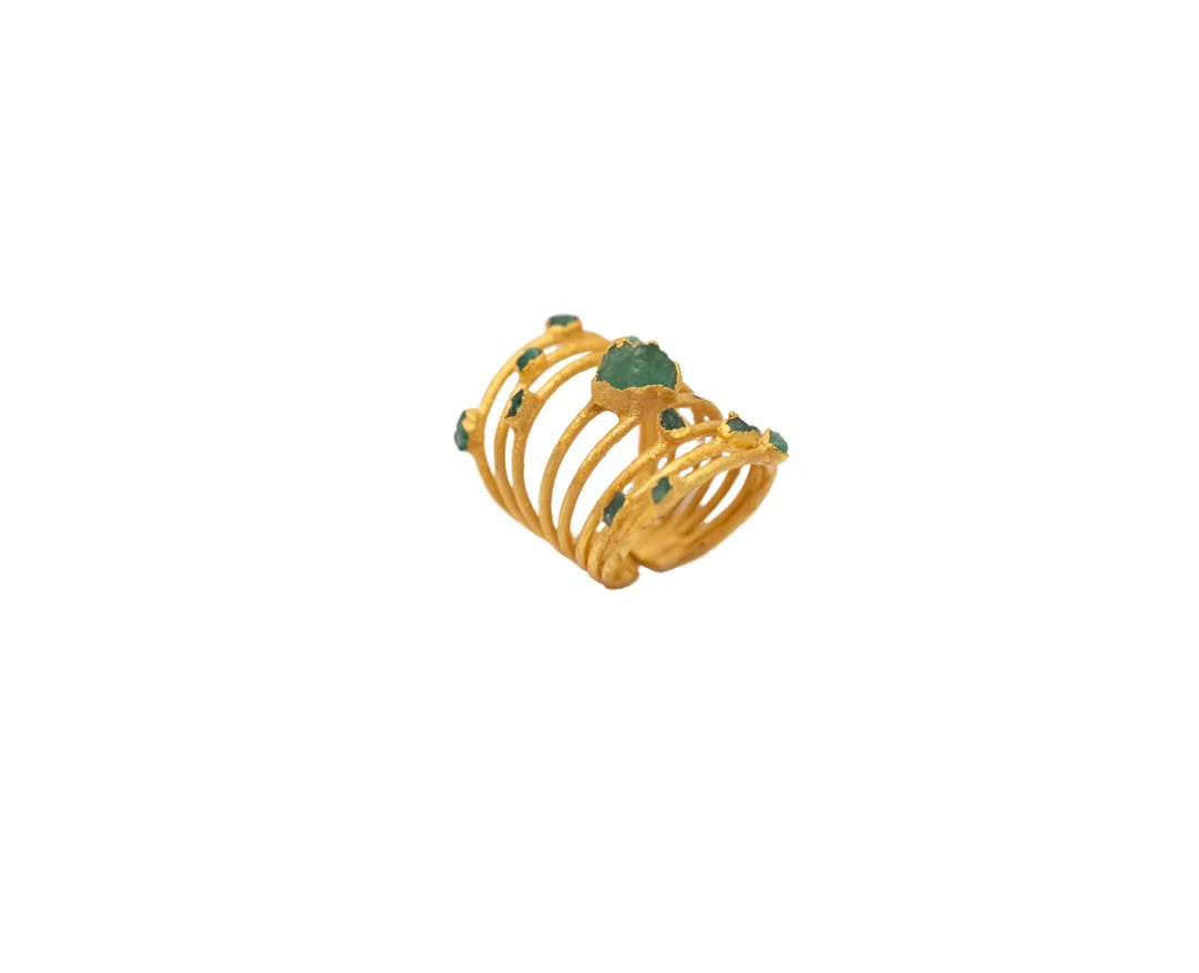Joyas de anillos en bronce con enchape en oro, esmeraldas naturales en bruto y piedras preciosas: Elegancia y Distinción.