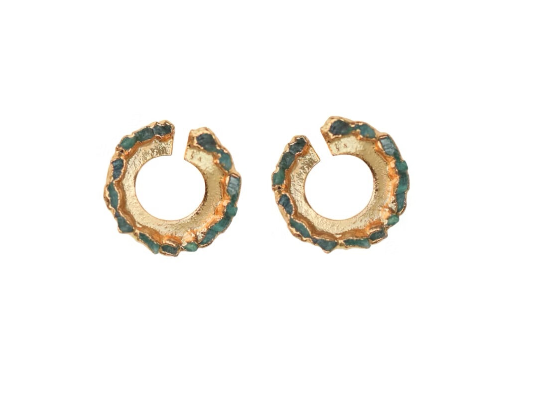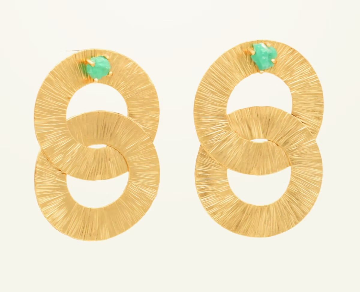 $170.000,00$170.000,00/Topos de doble círculo entrelazado con textura martillado y esmeralda en bruto. Joyas hechas en Bronce enchapado en Oro de 24 k. MEDIDAS: 5cm largo x 3 cm de ancho.PESO:...
