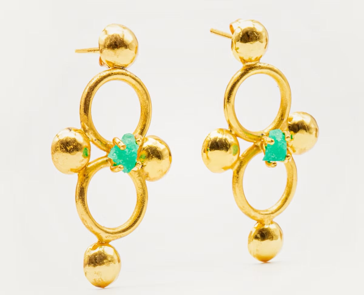 Joyas de pendientes pequeños en bronce con enchape en oro, esmeraldas naturales en bruto y piedras preciosas: Elegancia y Distinción.