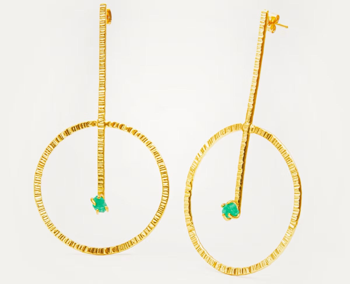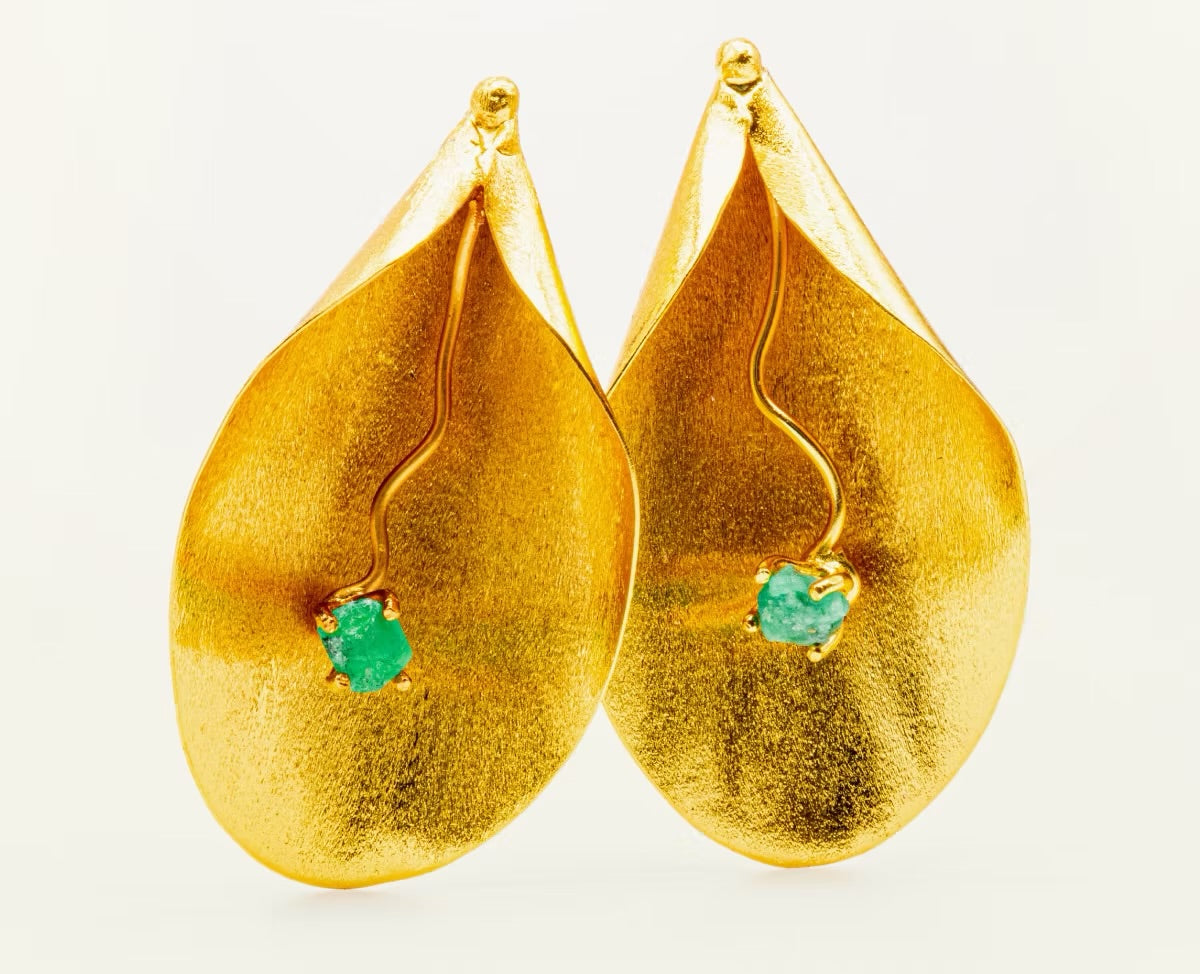 $190.000,00$190.000,00/Joya hecha en Bronce enchapado en Oro de 24 k. PESO: 7.6 gr C/U.MEDIDAS: 8,5 cm alto x 1,0 cm ancho con esmeralda. Joyería Contemporánea hecha a mano en Bogotá, Colombia.
