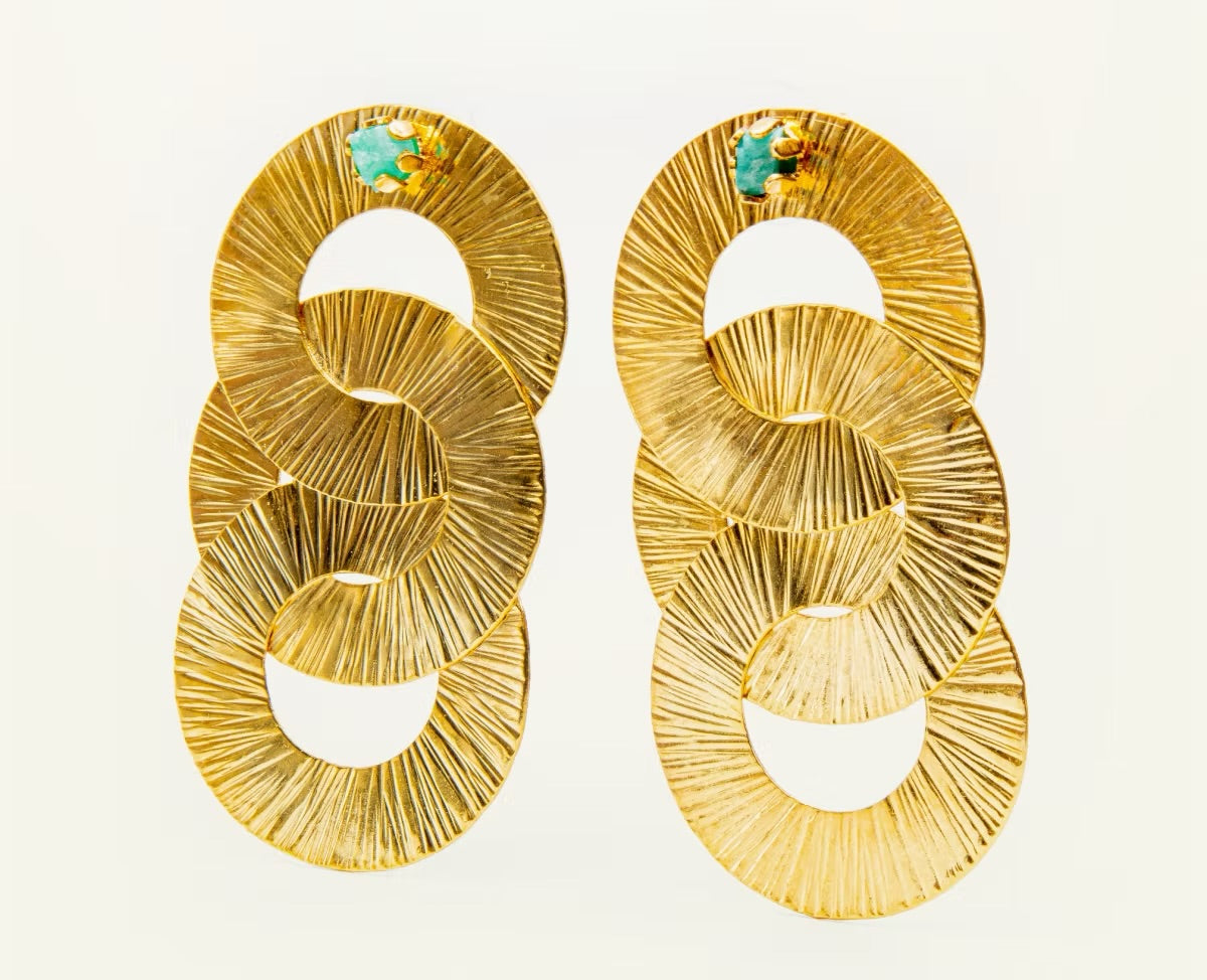 $150.000,00$150.000,00/Joya hecha en Bronce enchapado en Oro de 24 k. PESO: 3,3 gr C/U.MEDIDAS: Diámetro 3,1 cm x 0,5 cm Diámetro de Piedra. Joyería Contemporánea hecha a mano en Bogotá, Colombia.
