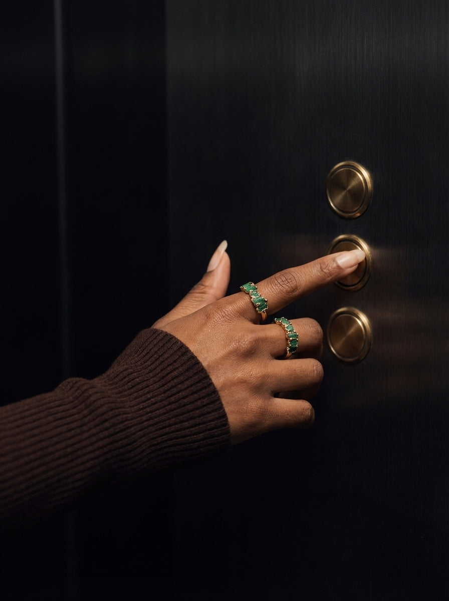 Anillo con esmeralda en bruto. Joya fabricada en bronce enchapado en oro de 24K. Todas nuestras piezas son libres de níquel.