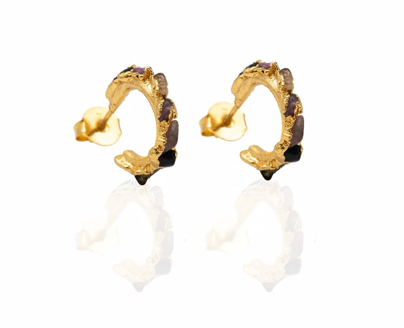 Candonga con turmalinas naturales en bruto incrustadas y fabricado en Bronce con enchapado en Oro de 24 k. Todas nuestras piezas son libres de níquel.