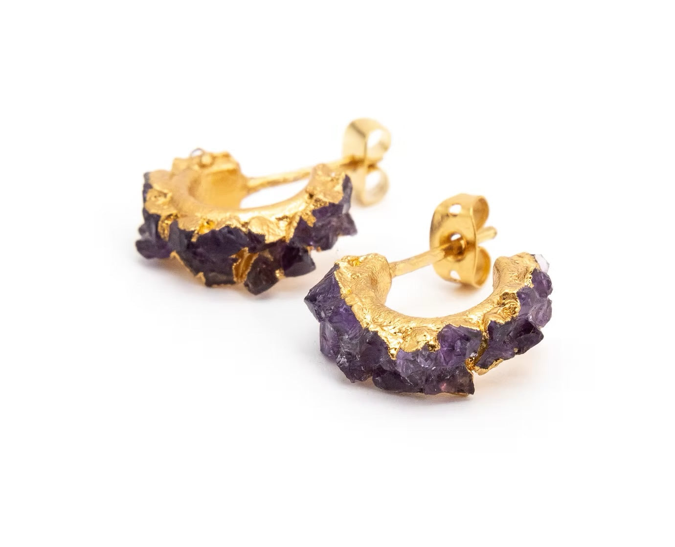 Joya con amatistas naturales en bruto incrustadas y fabricado en Bronce con enchapado en Oro de 24 k. Todas nuestras piezas son libres de níquel.