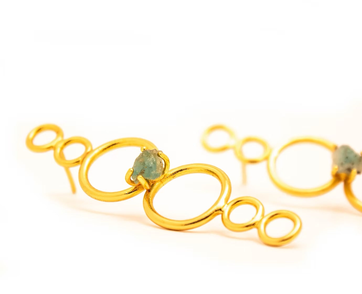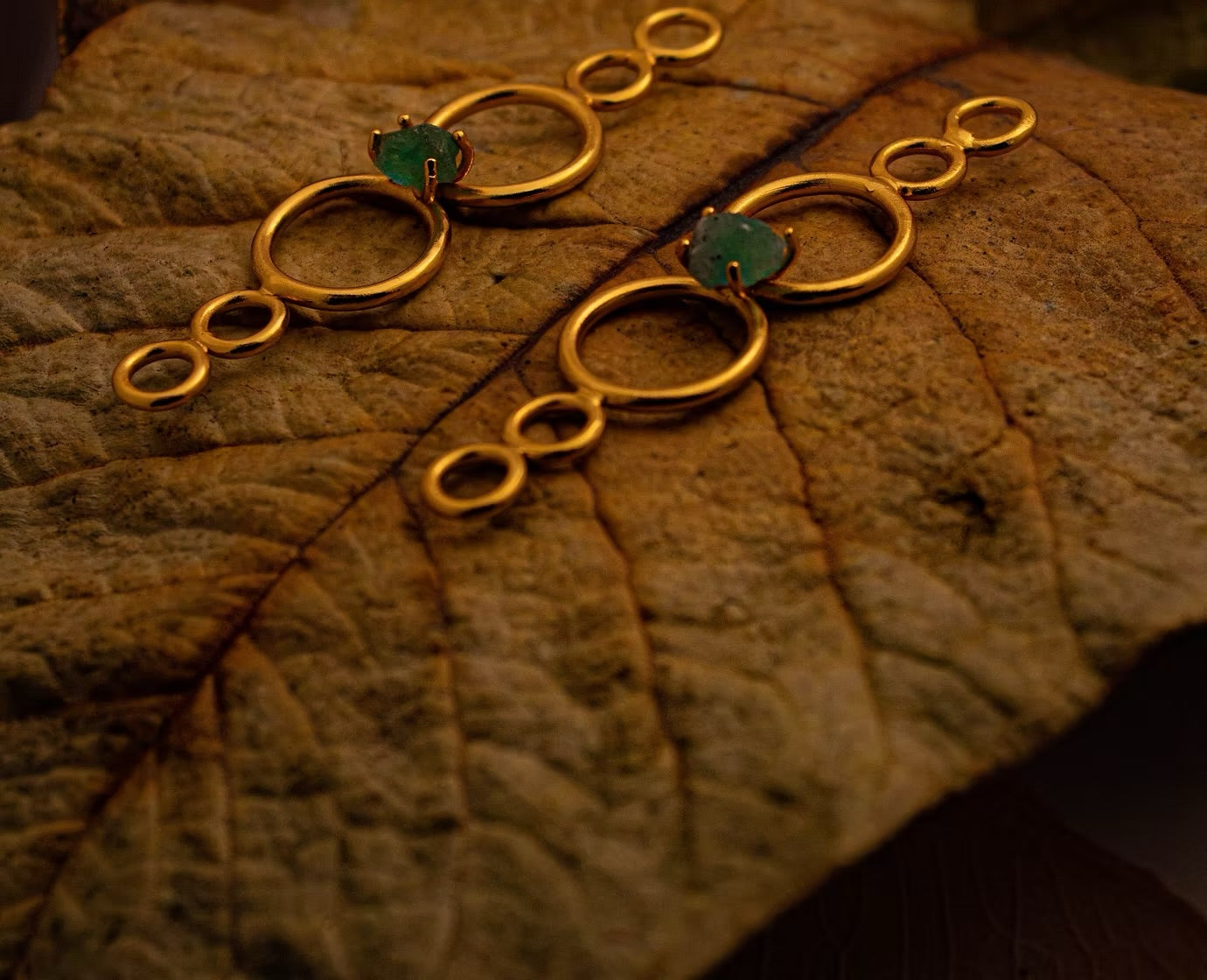 Topos 6 circulos, bronce enchapado en oro de 24 quilates, con esmeralda en bruto.
