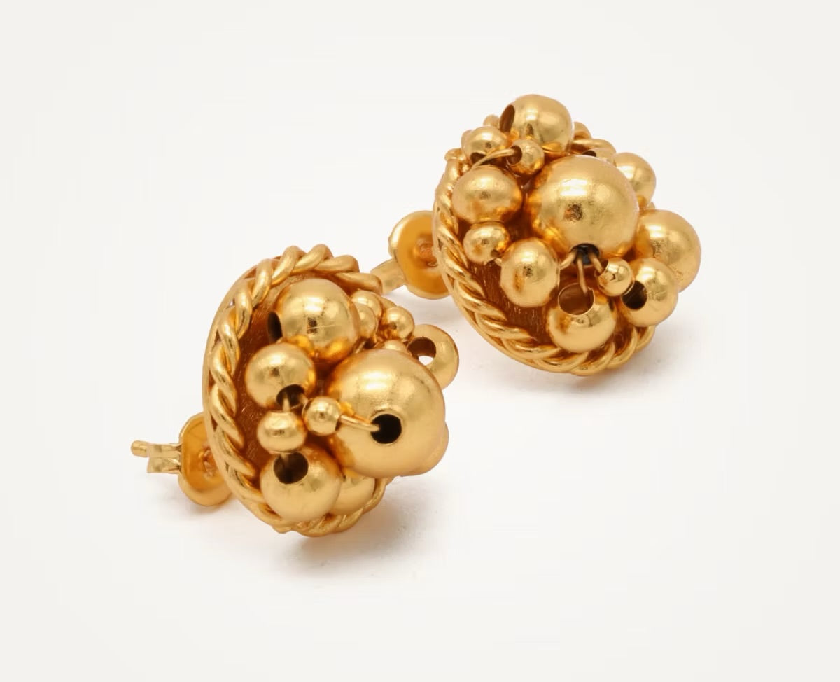 Topos con balines de diferentes tamaños tejidos y circulo con trenza en su contorno. Joya fabricada en bronce enchapado en oro de 24K.