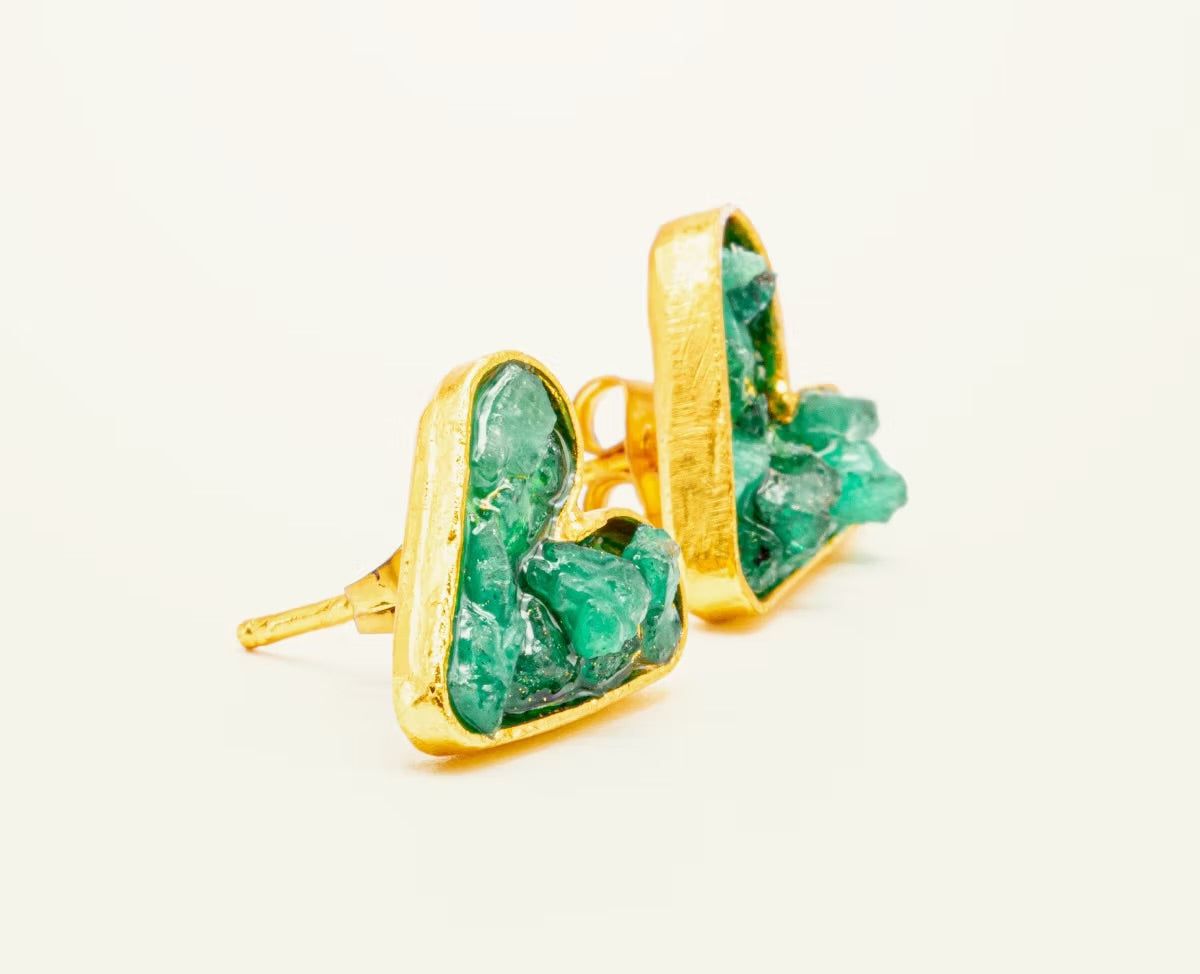 Joya exclusiva de L'AMOUR Collection, topo con esmeraldas naturales en bruto incrustadas y fabricada en Bronce con enchapado en Oro de 24 k. Todas nuestras piezas son libres de níquel.
