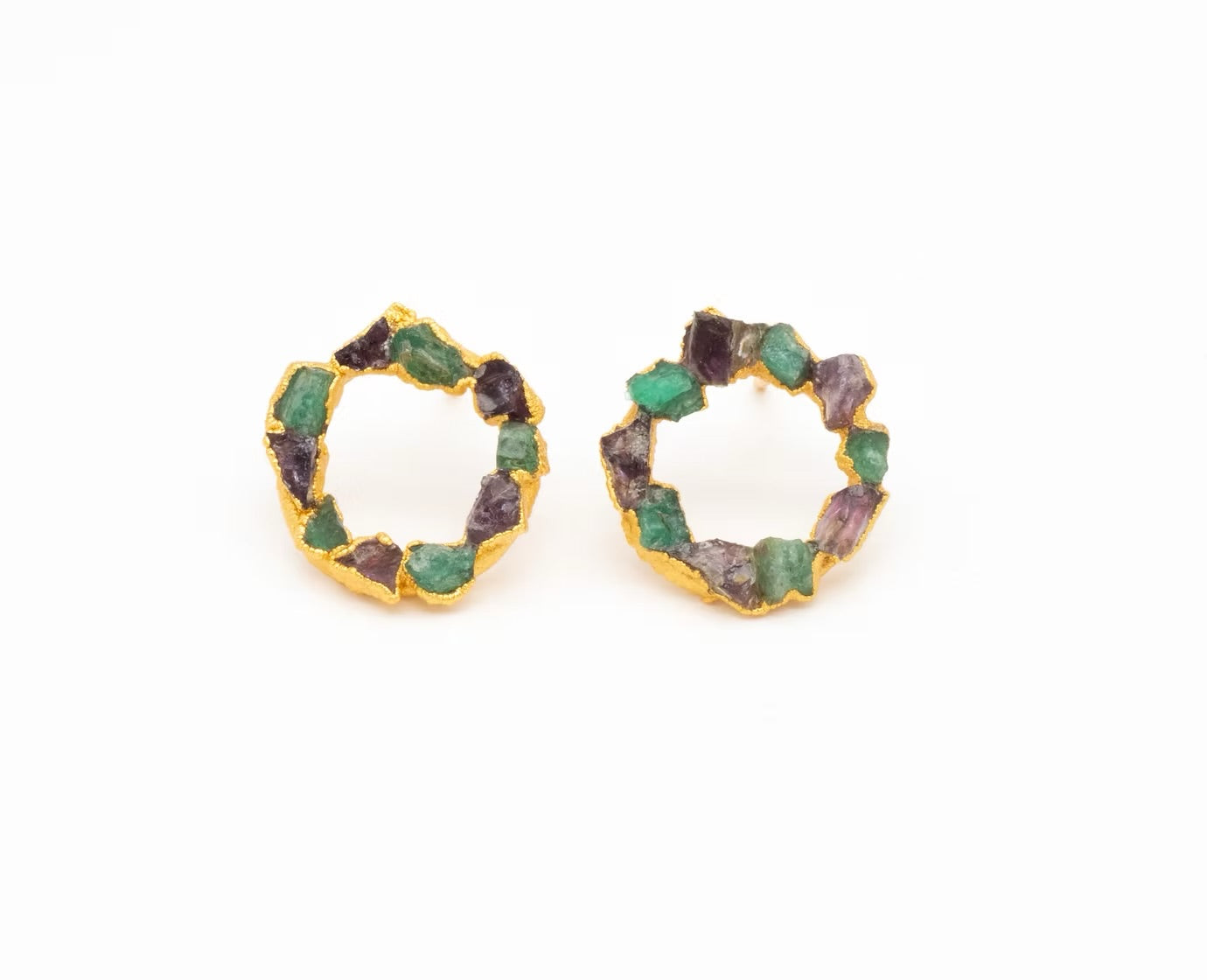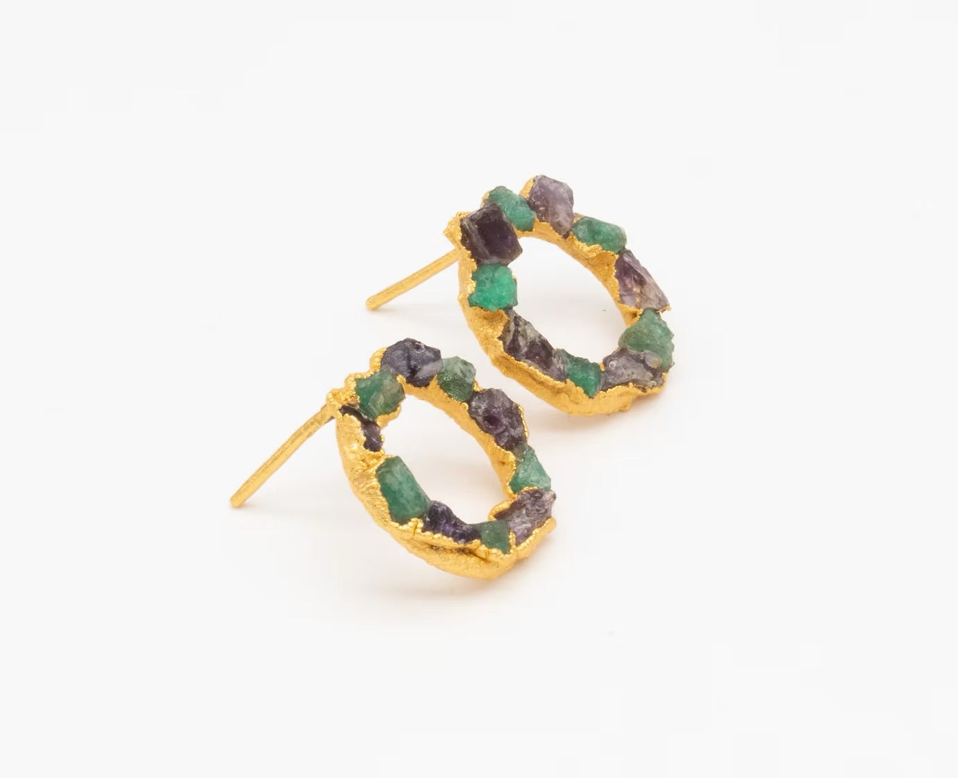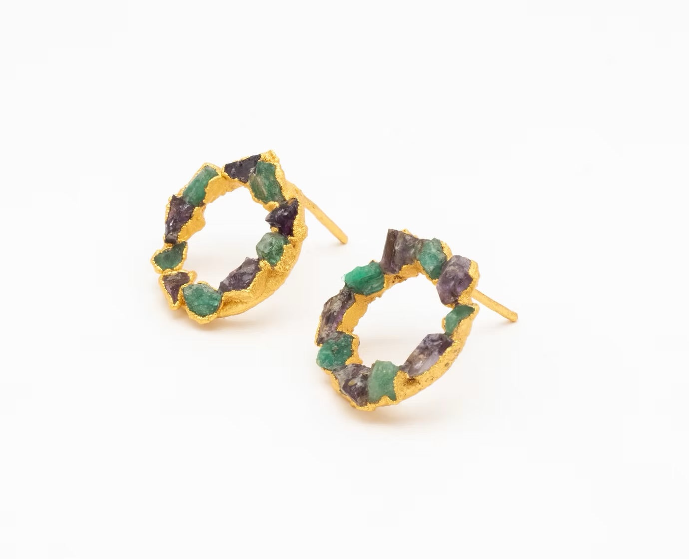 Topos con esmeraldas y amatistas en bruto. Joya fabricada en bronce con enchapado en oro de 24K. Todas nuestras piezas son libres de níquel.